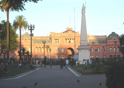 Иногда я езжу туда на автобусе. Он везет меня полчаса, давая возможность созерцать ночной Буэнос-Айрес. Город красиво и деликатно освещен фонарями и светом от витрин, так что грязи на улицах и скверах почти не видно. Проспекты сменяются узкими улочками, и наоборот, пока я не попадаю в "сердце" Аргентины, на Майскую площадь. С одной ее стороны находится главный католический собор, а с другой - президентский дворец или Розовый Дом. Автобус проезжает по правой стороне площади, на ходу приветствуя пару памятников, изображающих национальных героев, и проносится вплотную мимо розового дворца. Затем он объезжает дворец, делая огромный круг, на пути которого нет ни светофоров, ни мостовых. Здесь, внутри этого круга, как бы передвигаясь в пространстве, освещаемый мощными иллюминаторами, возвышается памятник Христофору Колумбу.